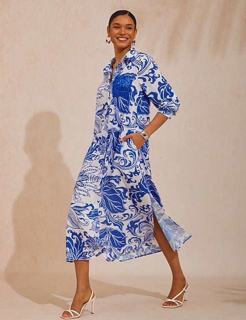 Sequin Apricot Curve Pocket Roll Up Sleeve Maxi Shirt Dress