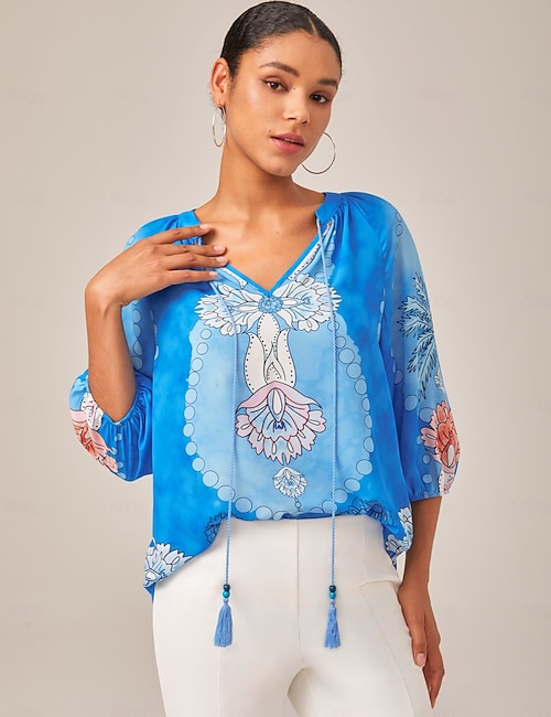 Satin Floral Lantern Sleeve V Neck Shirt