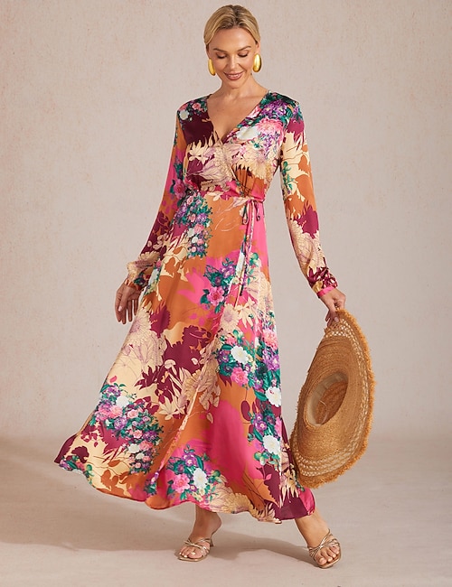 Sunset Bloom Reverie Silky Satin Floral Maxi Dress