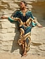 Satin Intricate Craftsmanship A line Leaf Print Long Sleeve V Neck Maxi Dress