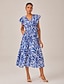 Leaf Print Drawstring Ruffle Sleeve Midi Dress
