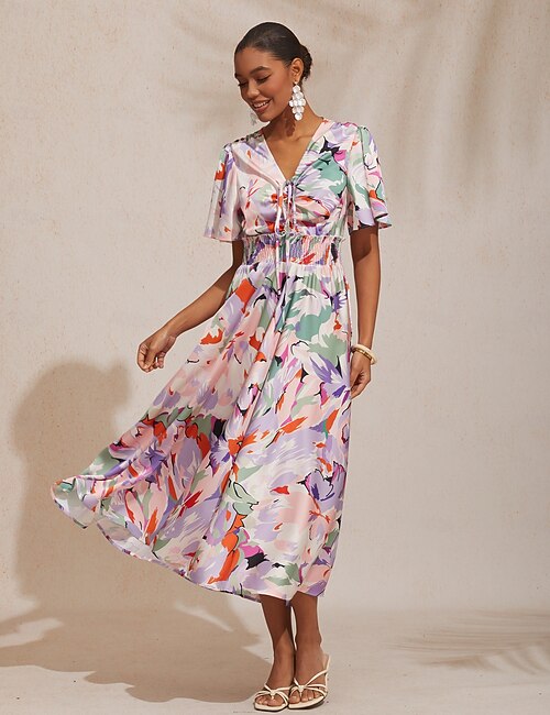 Satin Floral V Neck Zip Tie Maxi Dress