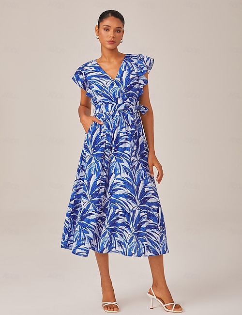 Leaf Print Drawstring Ruffle Sleeve Midi Dress