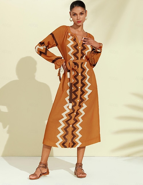 Chiffon Geometric Pattern Y Neck Casual Daily Maxi Dress