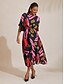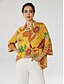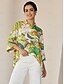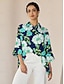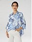 Hemdsilhouette; abstraktes Blumenmuster; Dreiviertelärmel; asymmetrischer Saum; verdeckte Knopfleiste.