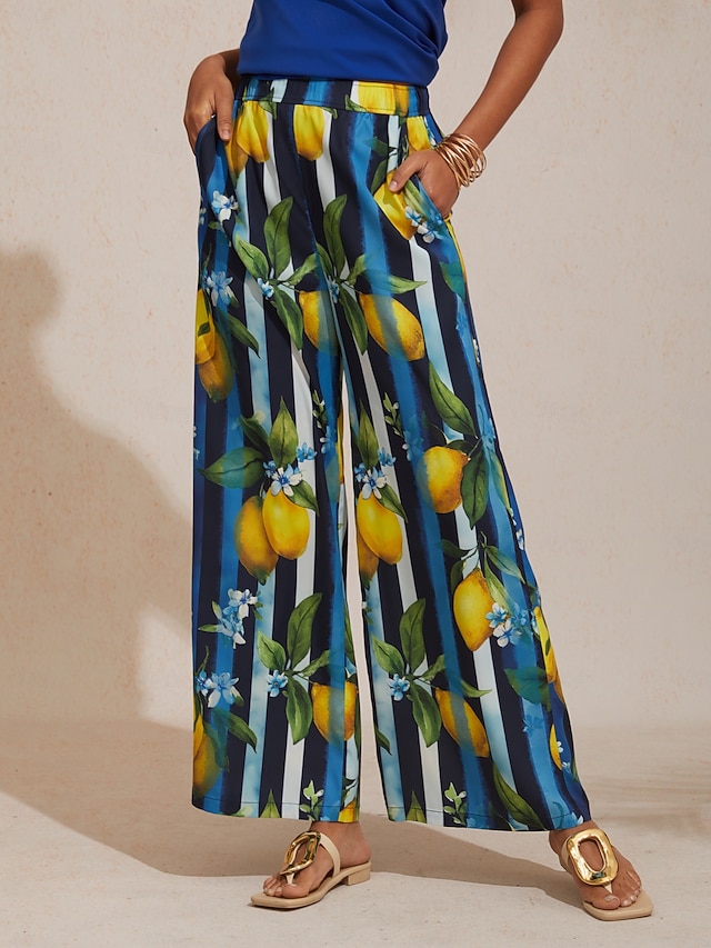 Satin Stripe Lemon Pattern Straight Pants#10201754