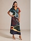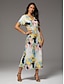 This elegant satin A-line dress features a striking abstract print, flattering V-neck, and delicate flutter sleeves. The empire waistline elongates the silhouette for a refined, flattering fit. A hidden zipper ensures easy wear and a sleek finish.