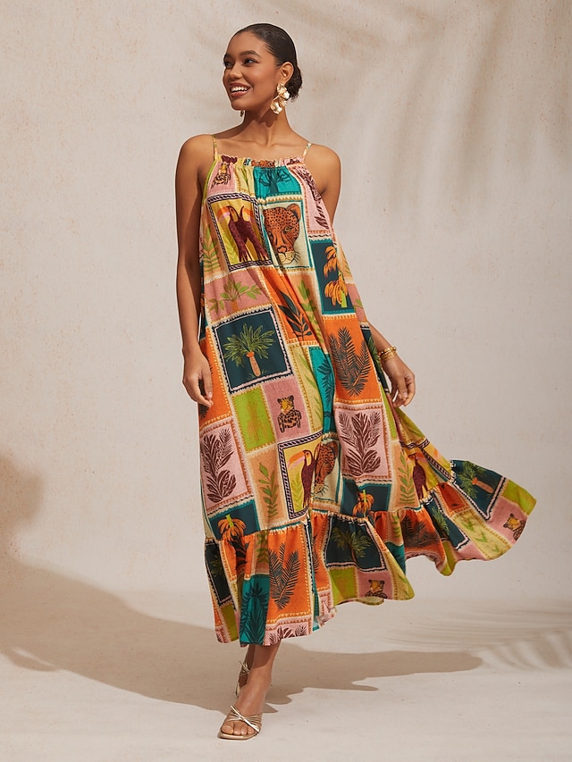Spaghetti strap dress, free and unrestrained, ideal for relaxed vacation settings
