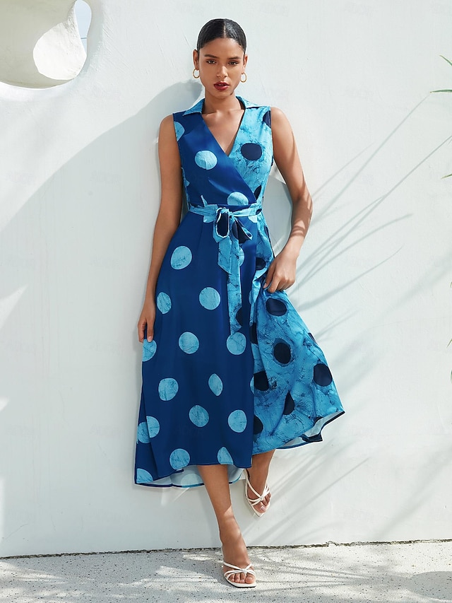 Satin Polka Dot Sleeveless Belted Midi Dress#18025204