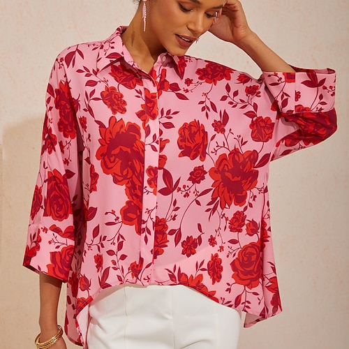 Blusa rosa de gasa fluida con diseño de capas y estampado floral primaveral.