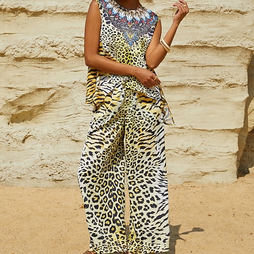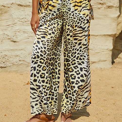 Vestido largo de gasa con mangas murciélago y joyas de leopardo vintage