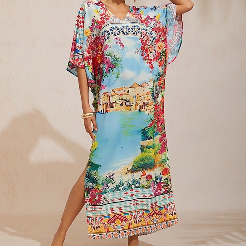 Vestido largo de gasa azul fluido con mangas murciélago, estilo Islas Baleares