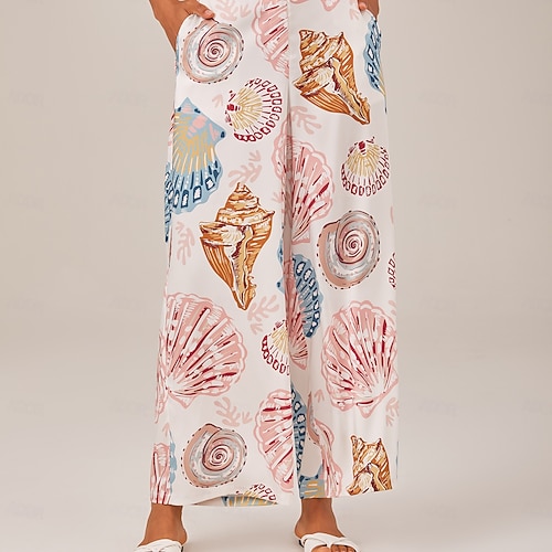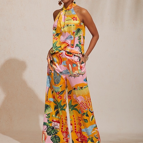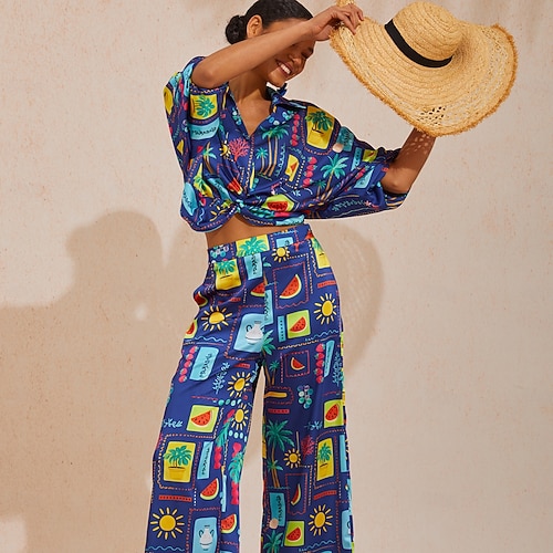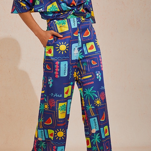 Pantalones florales de satén sedoso con estampado de palmeras hawaianas