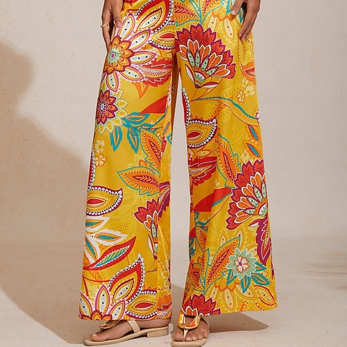 Pantalones anchos de satén sedoso con estampado floral, ideales para una escapada de verano.