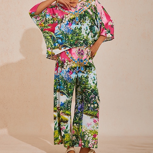 Blusa asimétrica de satén sedoso con mangas murciélago y estampado de flores primaverales.