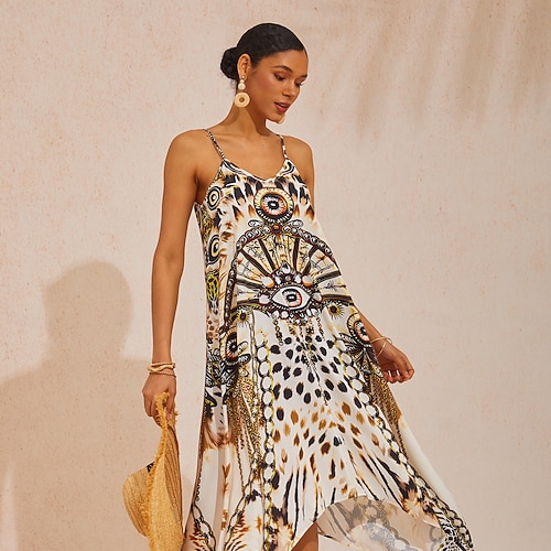 vestido largo de satén sedoso con estampado abstracto para vacaciones