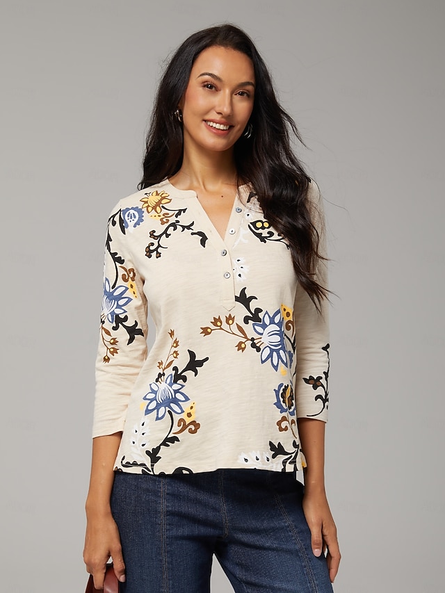 Cuello redondo; mangas tres cuartos; estampado floral; tejido 100% algodón; textura irregular.