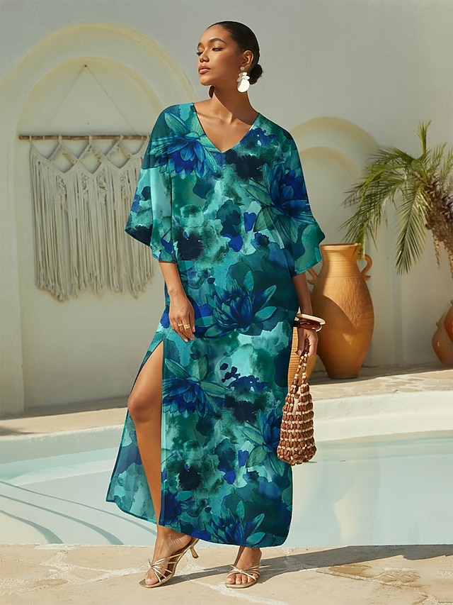 Abstract Dolman Sleeve Chiffon Maxi Dress#19777946