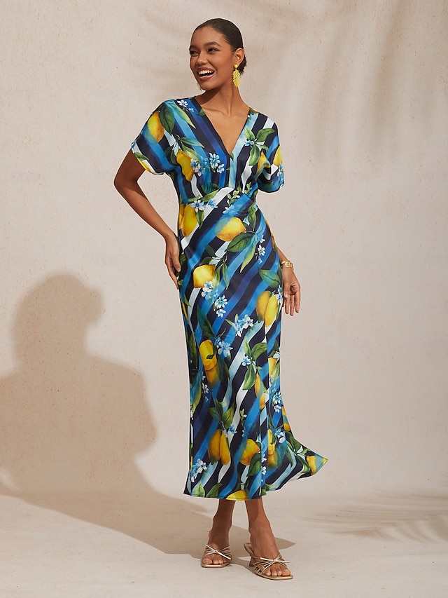 Stripe Lemon Pattern Waist Cinching Satin Maxi Dress#17940239