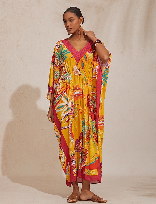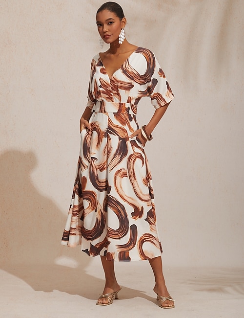 Abstract Batwing Sleeve Cinched Maxi Dress