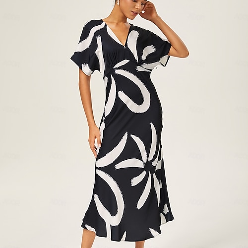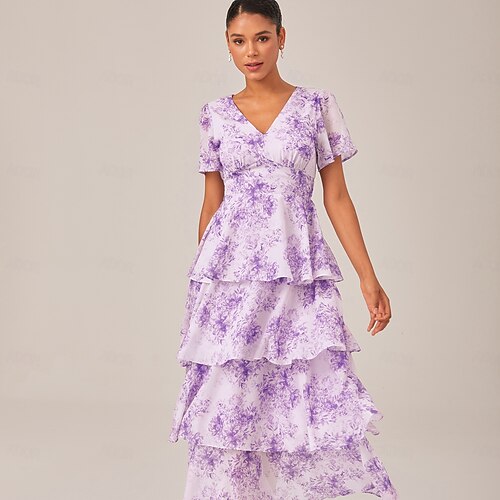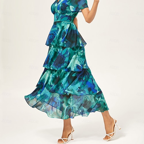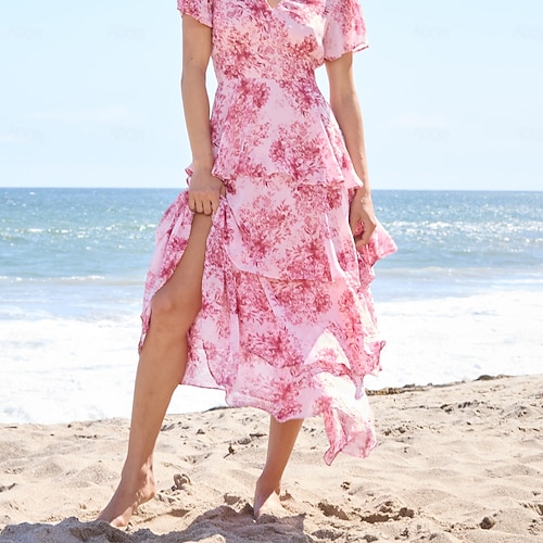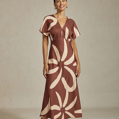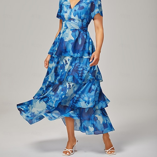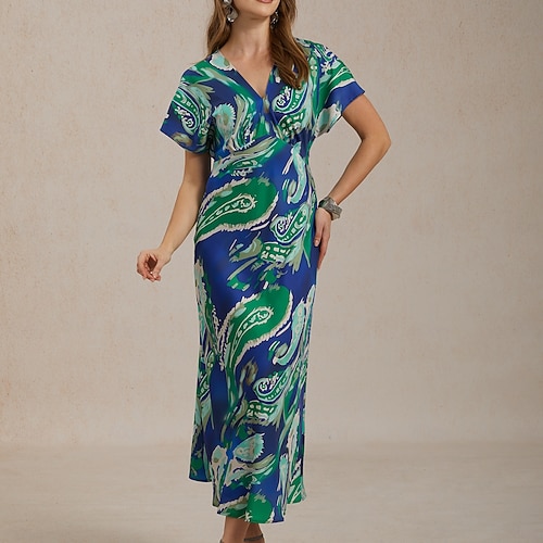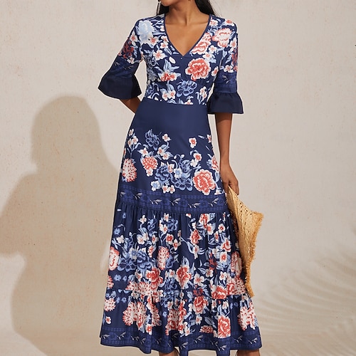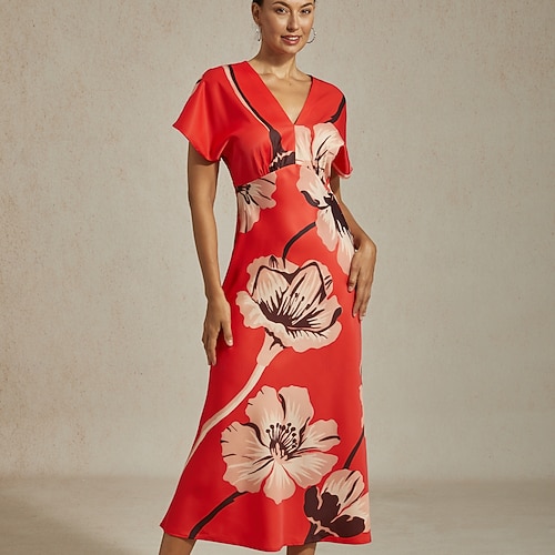 High Waist Short Sleeve Floral V Neck Maxi Dress