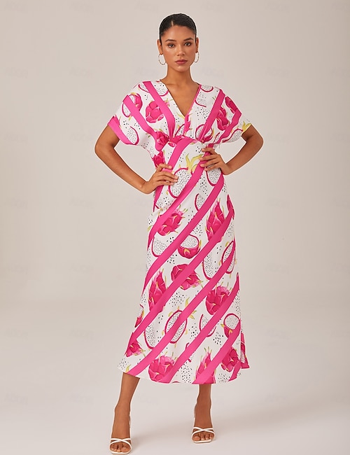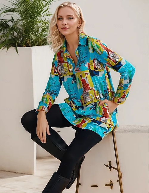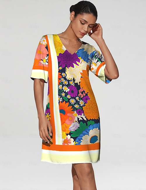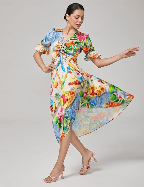 Pumpkin Print V Neck Asymmetrical Shirt Dress