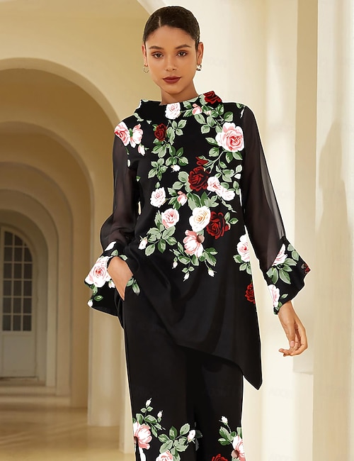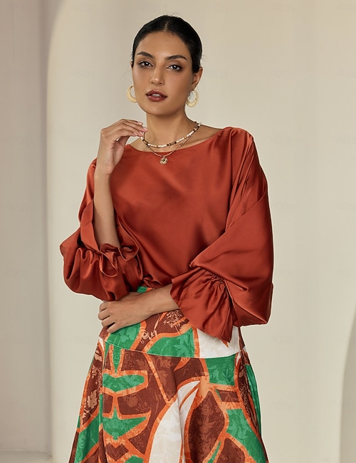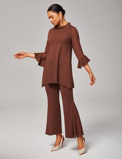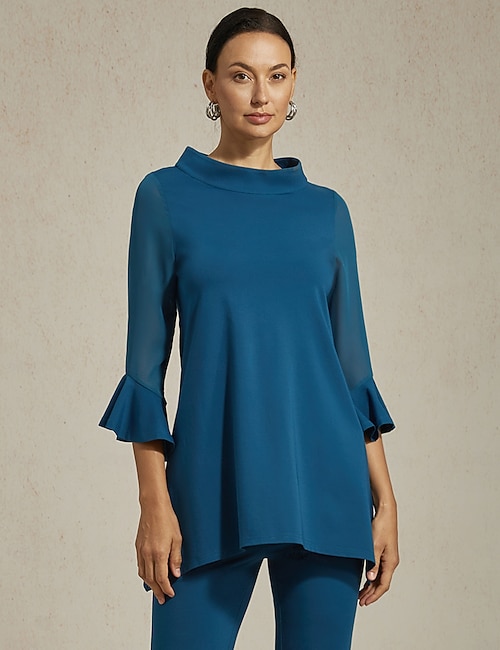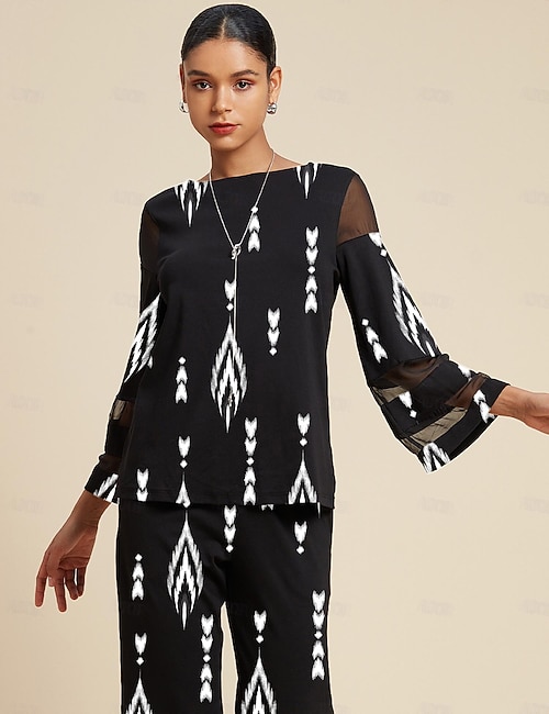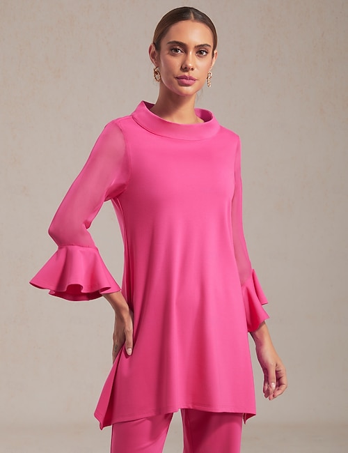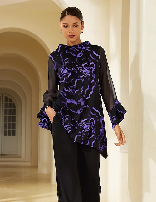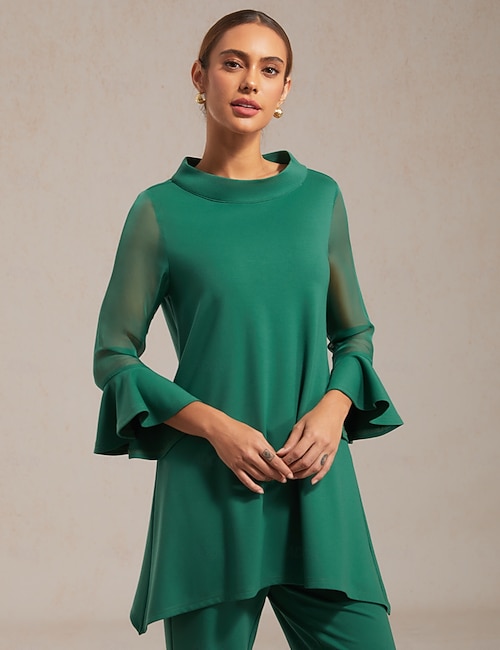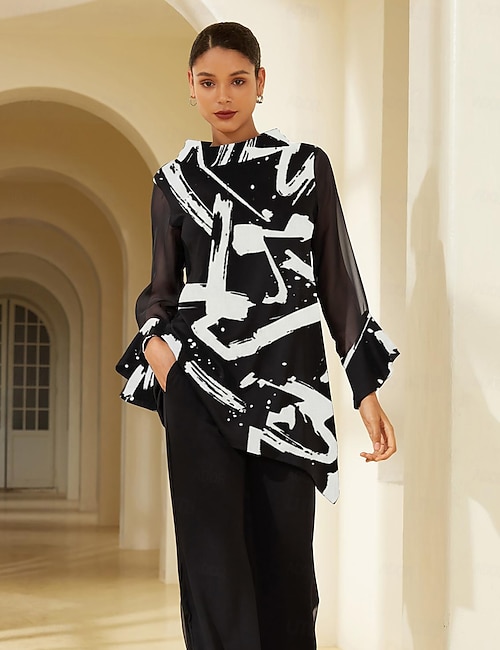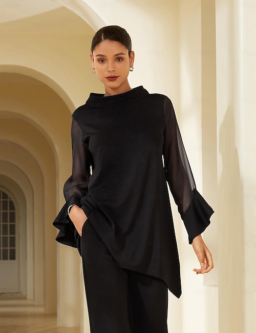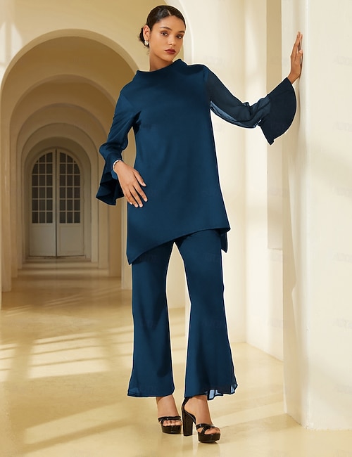 Modal Flare Cuff Blouse & Chiffon Pants Set Flare Cuff Modal Blouse Chiffon Pants Set