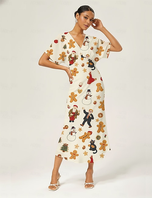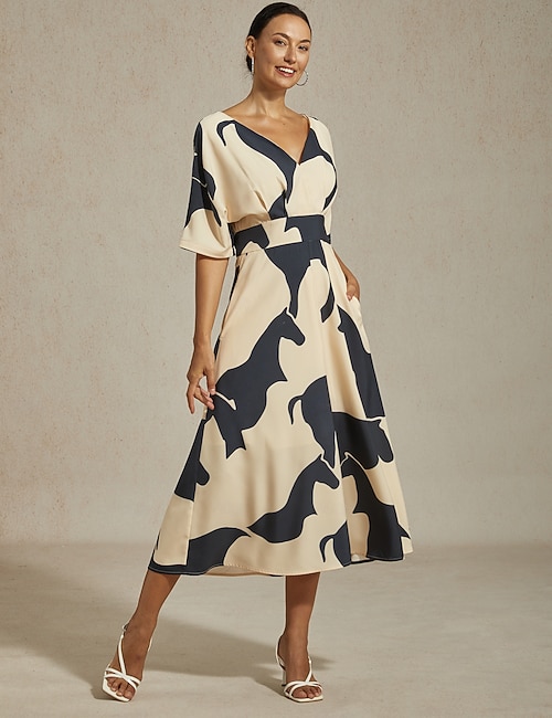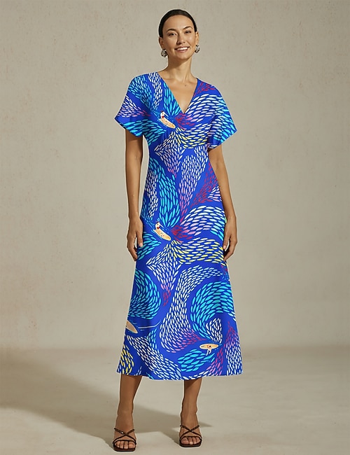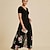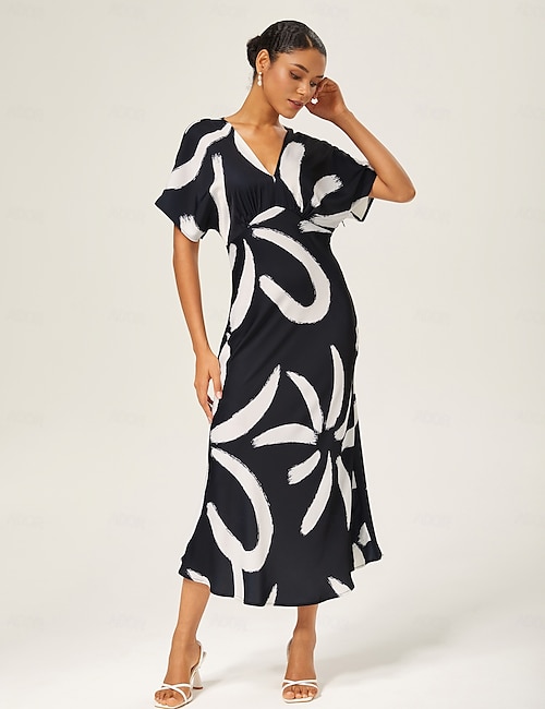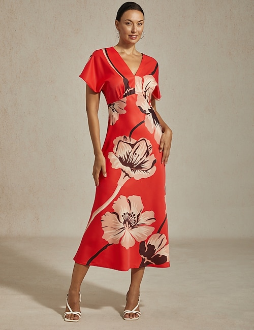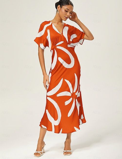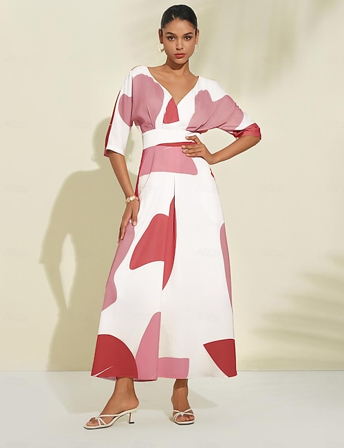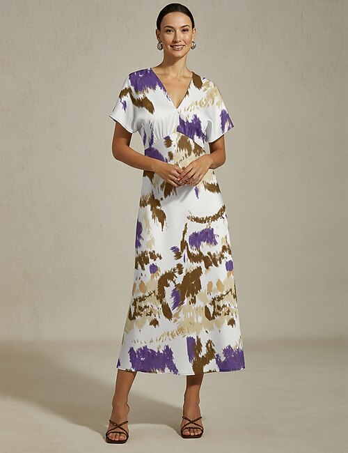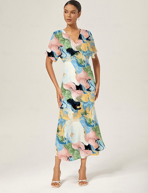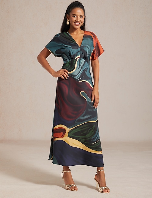 Satin Abstract V Neck Waist Tie Maxi Dress