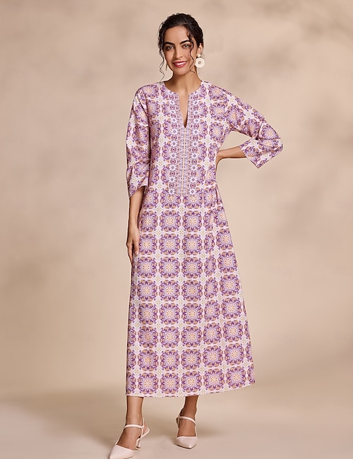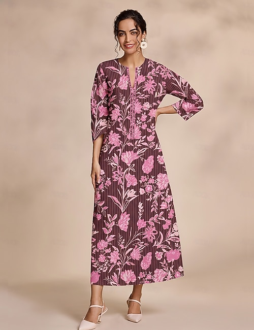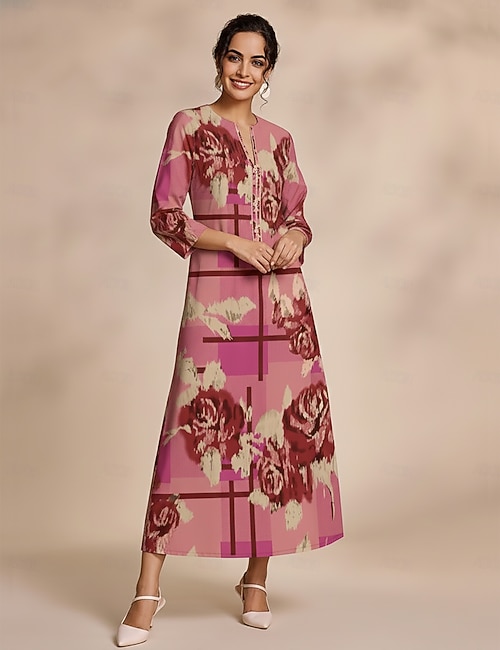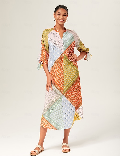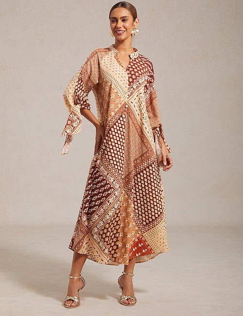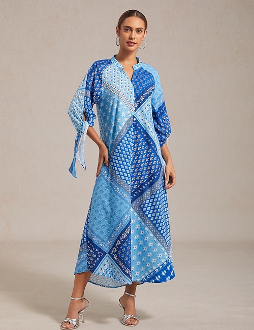 Geometric Floral Patchwork Stand Collar Maxi Dress