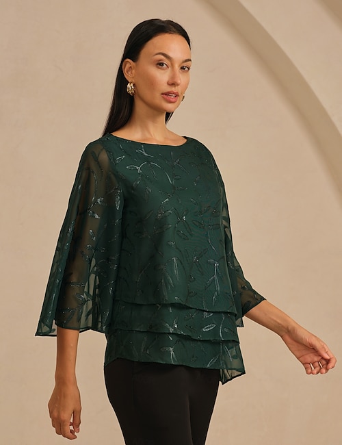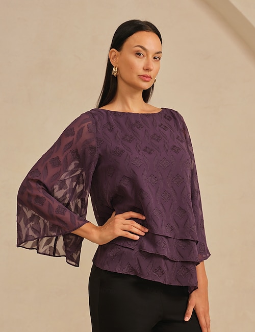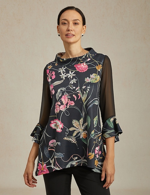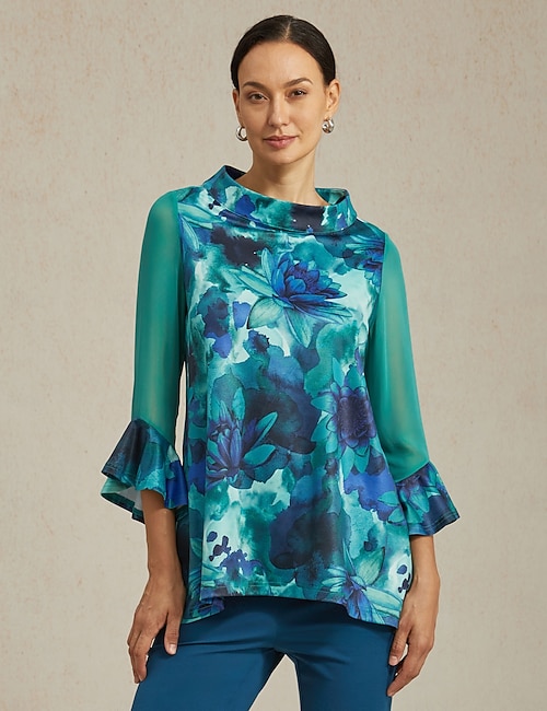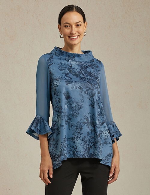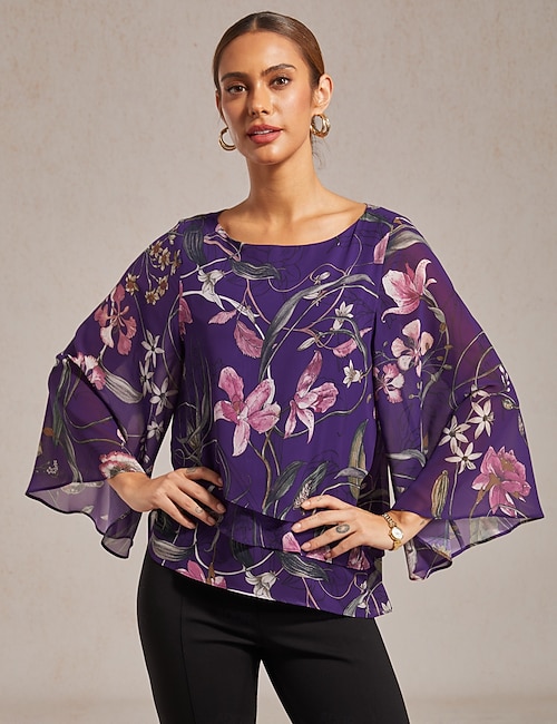 Floral Print Chiffon Sleeve Bateau Neck Blouse