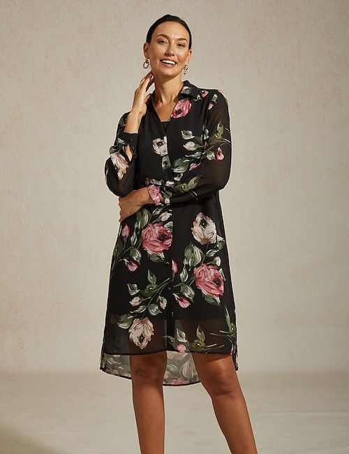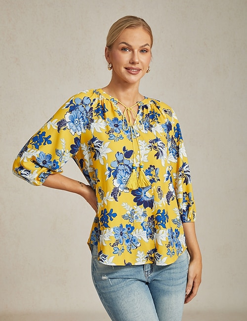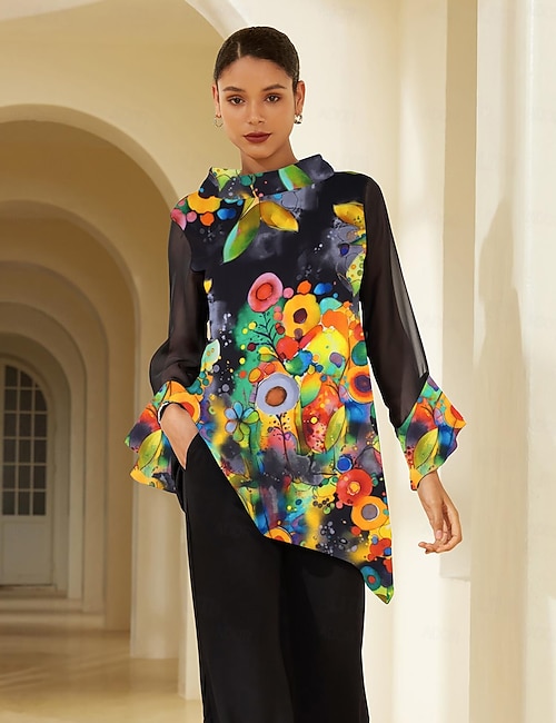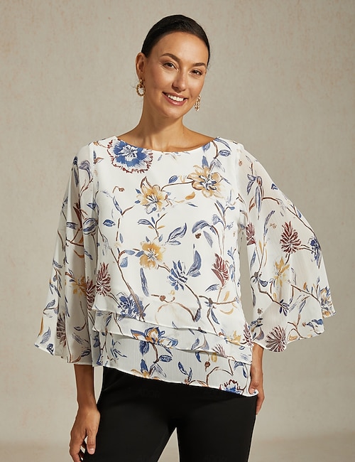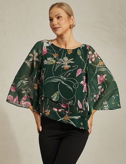 Floral Print Bateau Neckline Chiffon Sleeves Blouse