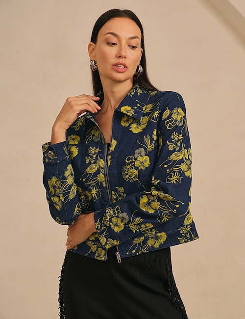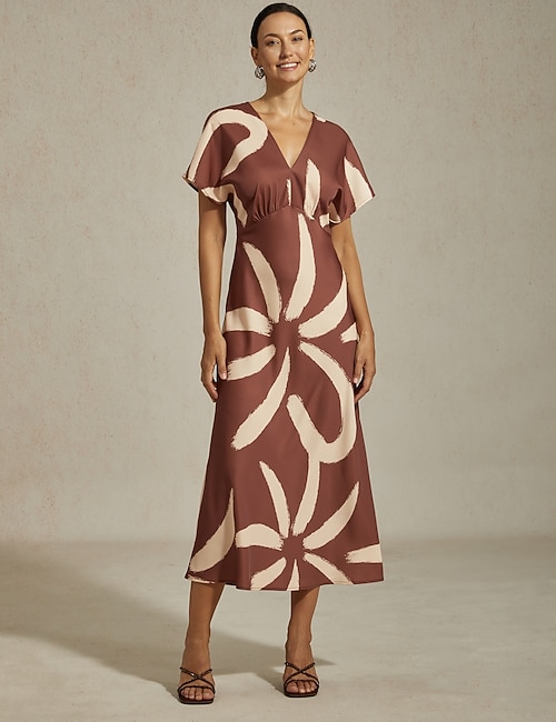 Stretch Knit Midi Dress Abstract Floral Print Contrast Zipper
