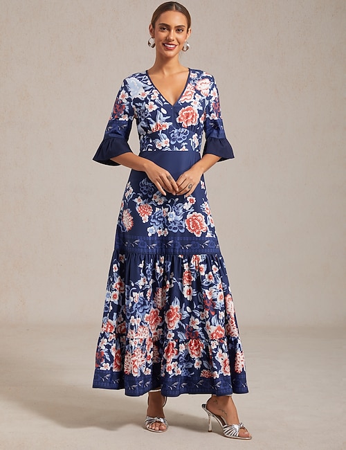 Abstract Floral Print Asymmetric Ruffle Maxi Dress
