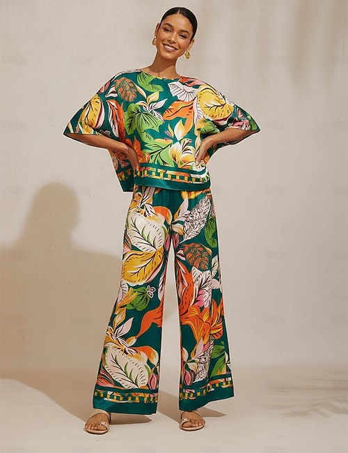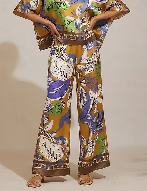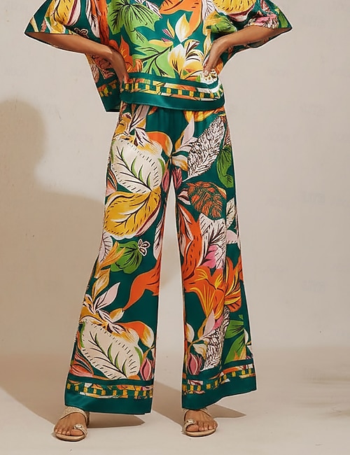 pantalon à fleurs en satin soyeux à motifs de palmiers hawaïens
