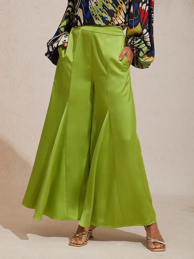 Pantalon droit à jambes larges, taille élastique, fermeture éclair, vert