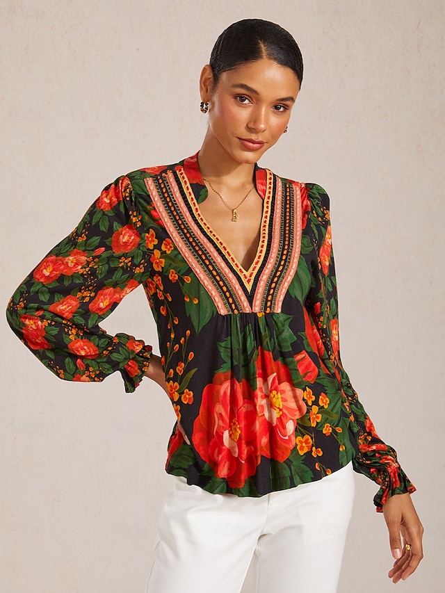 Conçue avec une coupe ample et décontractée, cette pièce présente un décolleté en V flatteur et d'élégantes manches bouffantes qui ajoutent une touche de charme féminin à son imprimé artistique.
