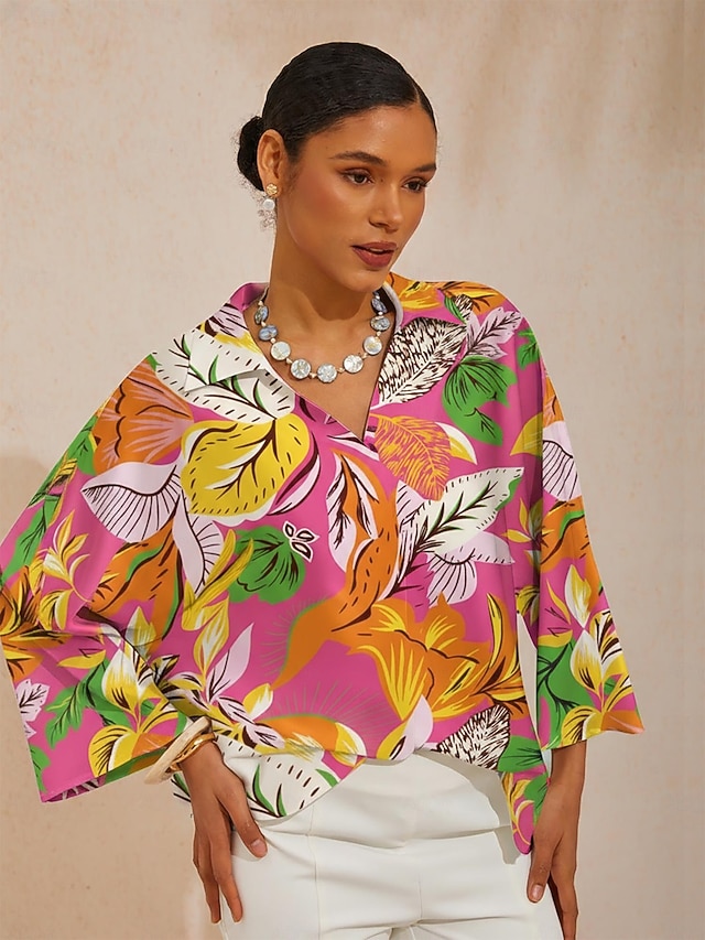 Col de chemise ; manches chauve-souris ; manches trois-quarts ; imprimé floral