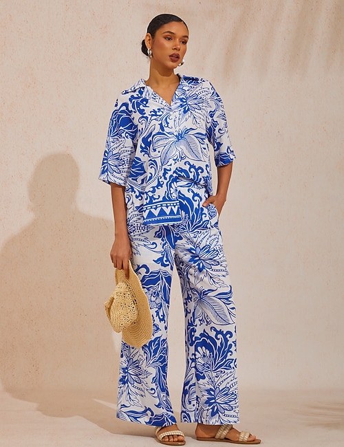 pantaloni da vacanza in raso di seta color indaco tigrato