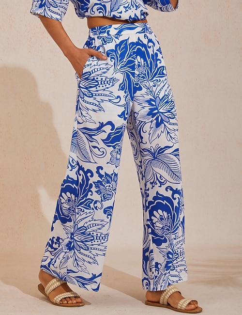 pantaloni a gamba larga in raso setoso con fiori primaverili
