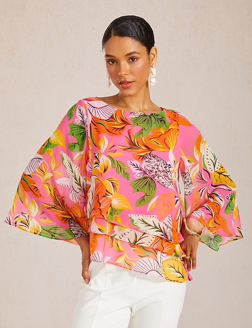 top in raso setoso con maniche a pipistrello e motivo ibisco selvatico.