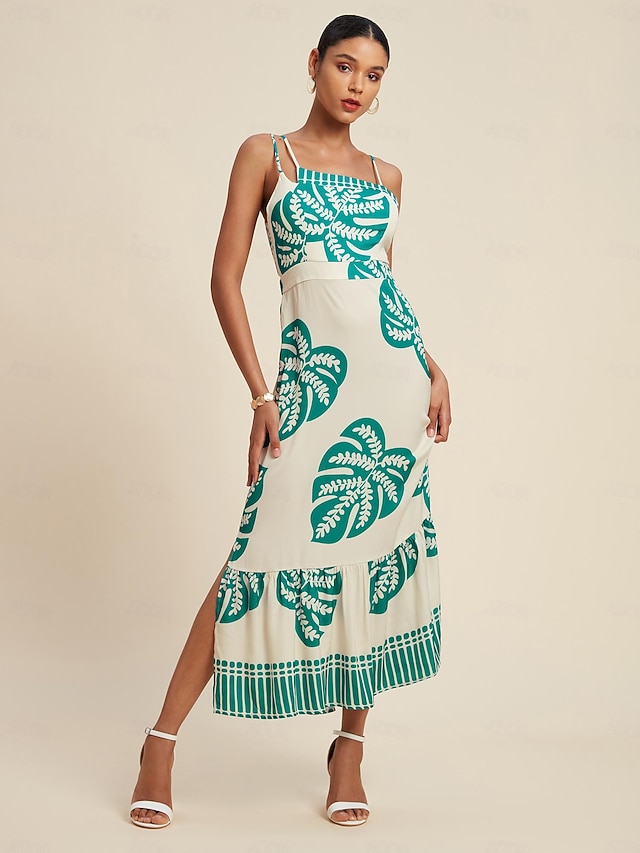 Palm Leaf Satin Maxi Dress#12432503