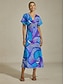 This elegant satin A-line dress features a striking abstract print, flattering V-neck, and delicate flutter sleeves. The empire waistline elongates the silhouette for a refined, flattering fit. A hidden zipper ensures easy wear and a sleek finish.