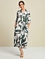 Linen Palm Print Button Down Midi Shirt Dress