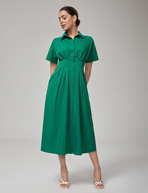 Cotton Pleated Waist Shirt Dress
