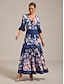 Decote em V, estampa floral, bainha com babados em camadas, mangas médias alargadas